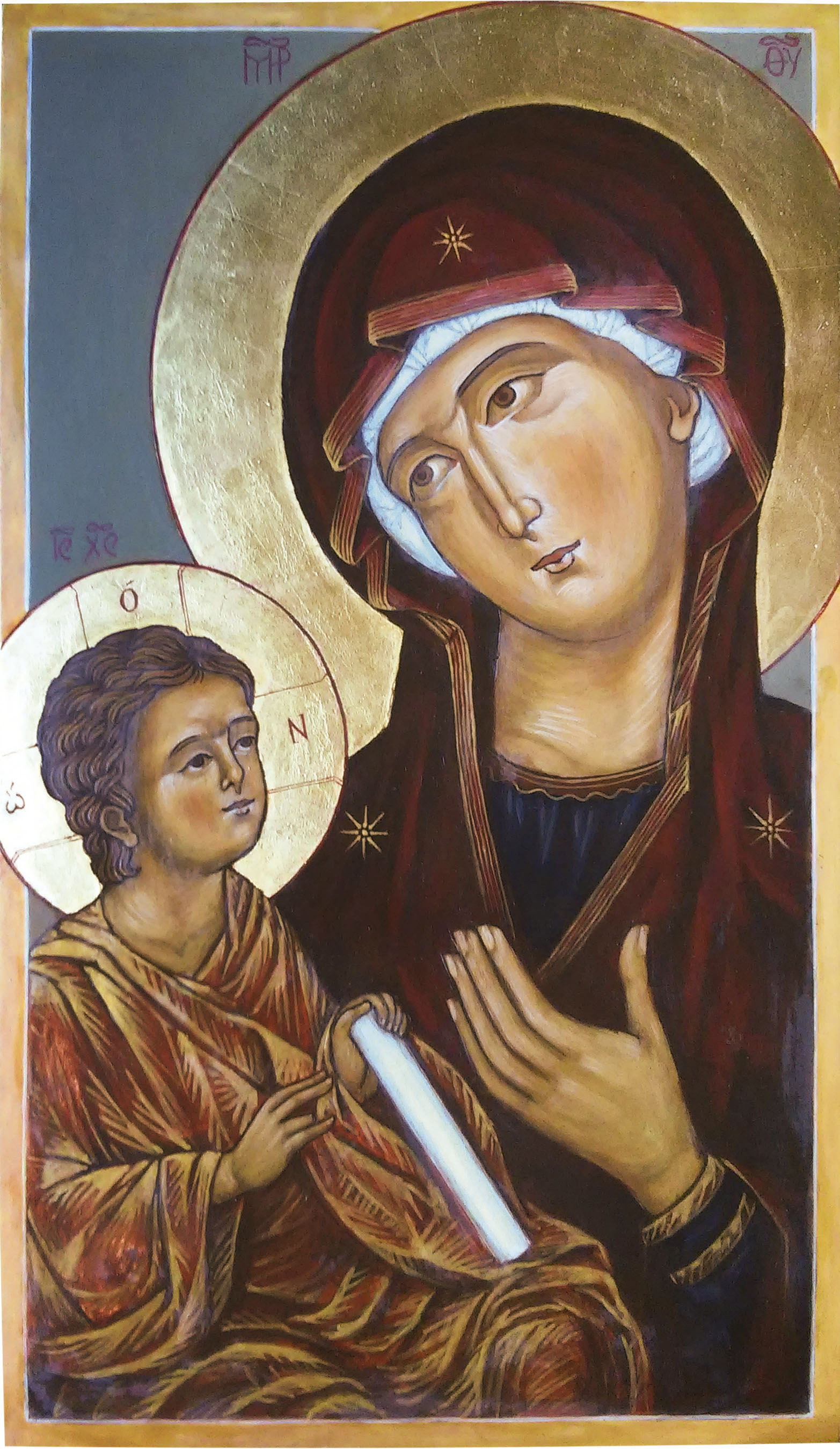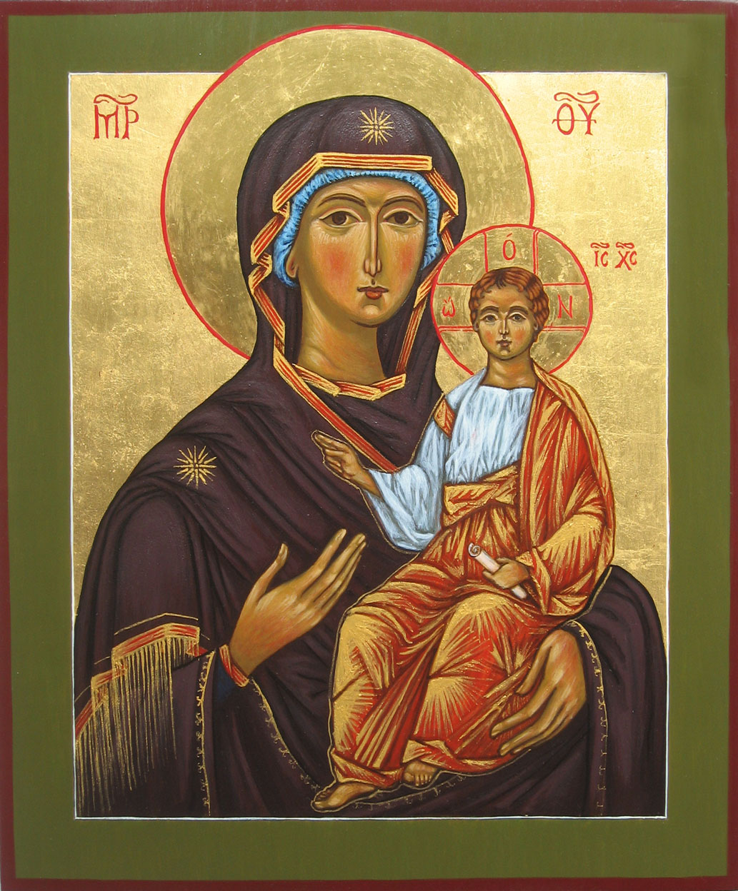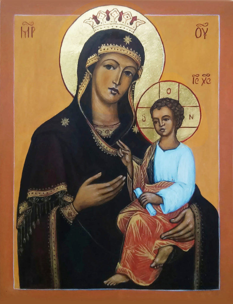 w prawo. Wznosi prawą dłoń w geście błogosławieństwa (lub wskazuje na Matkę), a w lewej dłoni trzyma zwój (od XVI w. także księgę lub kulę). Chrystus nie jest tutaj niemowlęciem, występuje w ikonograficznym typie Chrystusa – Emmanuela, ma twarz dojrzałego, inteligentnego człowieka. Ubrany jest w biały chiton i narzucony nań purpurowy, często przetykany złotem himation. (za Wikipedia)