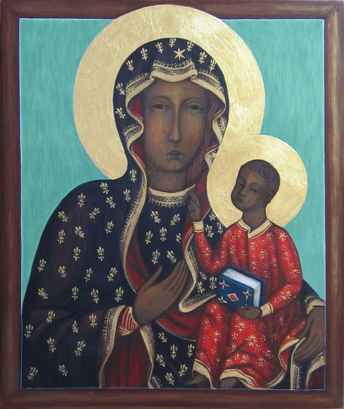 Chrystus znajduje się w pewnym oddaleniu od twarzy Matki, patrzy prosto przed siebie i ukazuje całe swe oblicze. Rzadziej ma głowę lekko obróconą